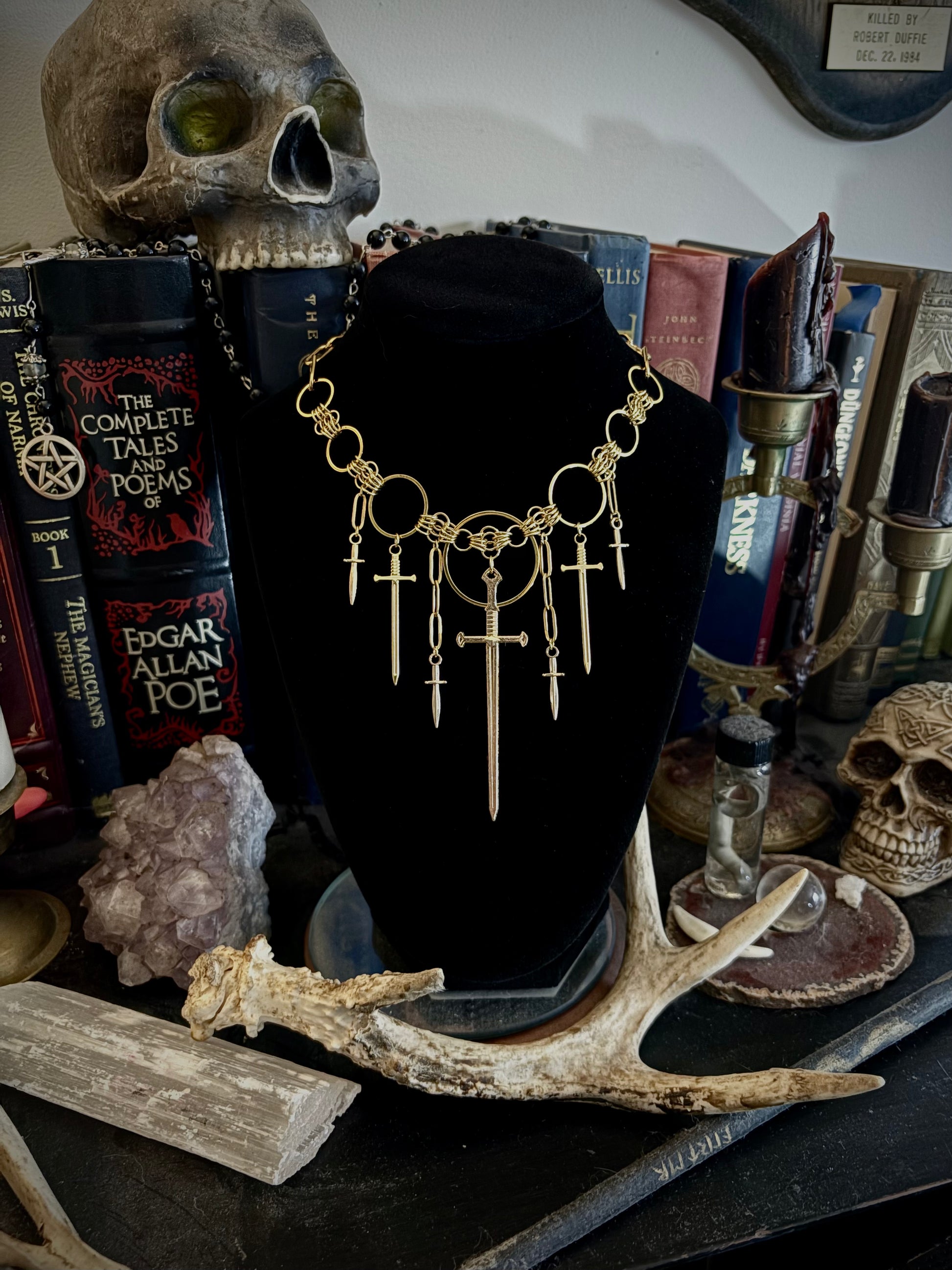 A bold, gothic statement necklace featuring 3 graduating sword pendants and cascading dagger charms on a heavy linked collar. Perfect for layering over high collars or worn alone as the centerpiece of a dark, romantic look. This piece was designed for people who treat jewelry like armor. The interplay of rings, chainmail-style connectors, and suspended blades gives motion and presence — ideal for gothic wardrobes, stage looks, bridal alternatives, or everyday ritualwear.