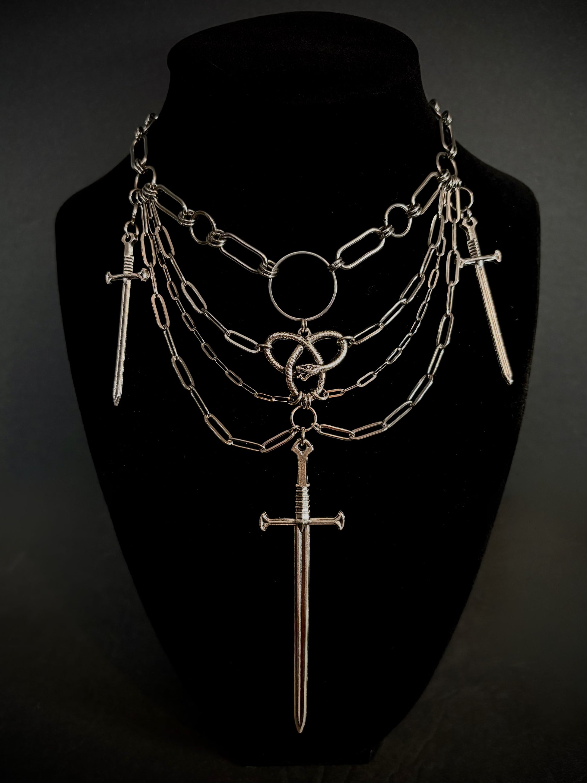 Command attention with this bold, gothic-inspired statement piece. The multi-layered design combines heavy chain links with epic sword pendants and a snake knot center piece, making it the perfect accessory for dark fashion, alternative styles, or anyone who wants to bring a fierce medieval touch to their look.