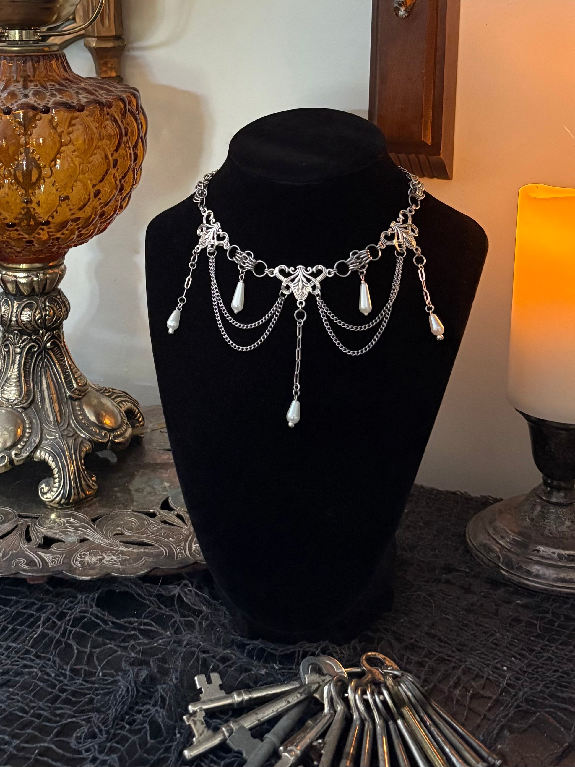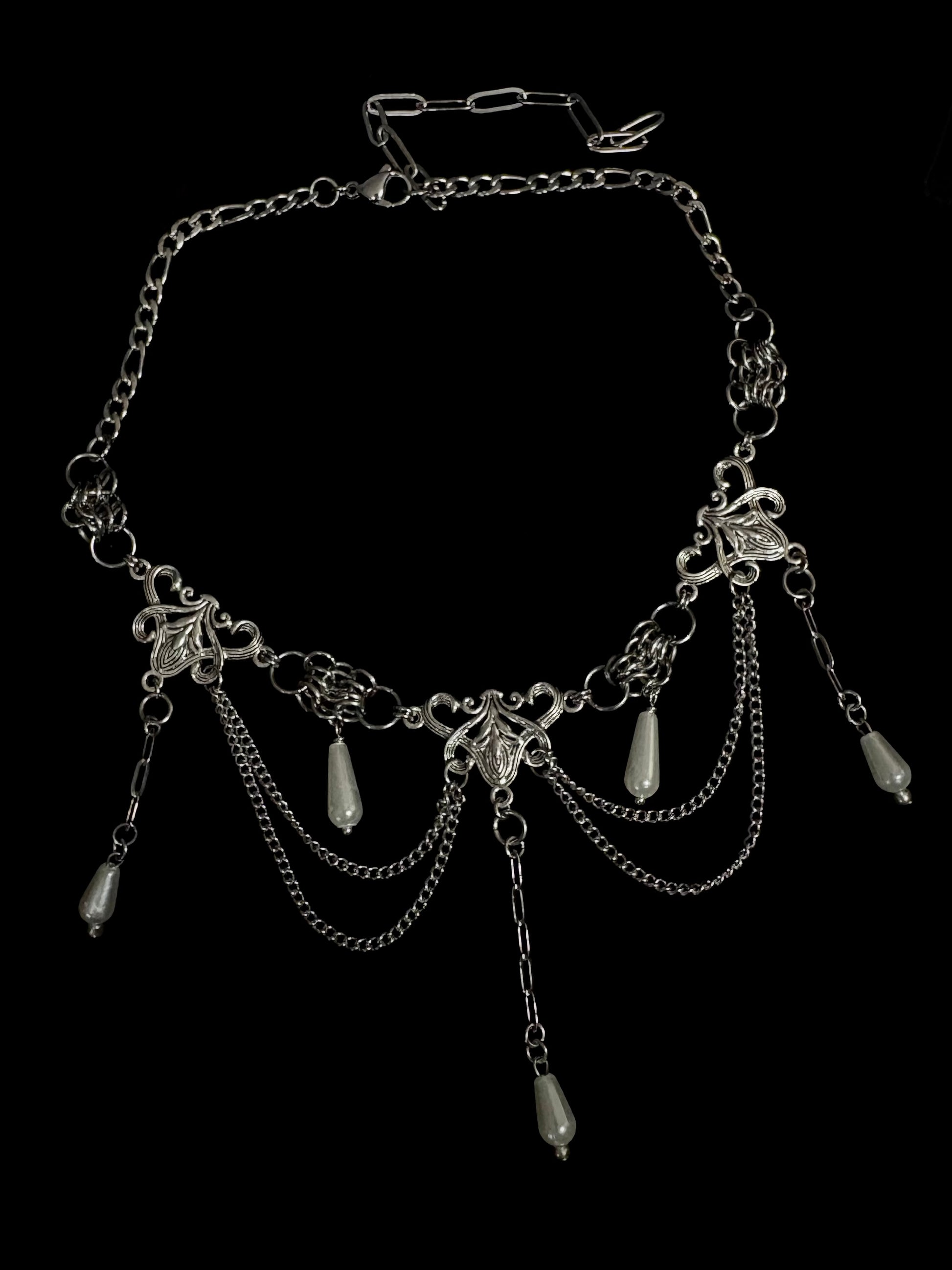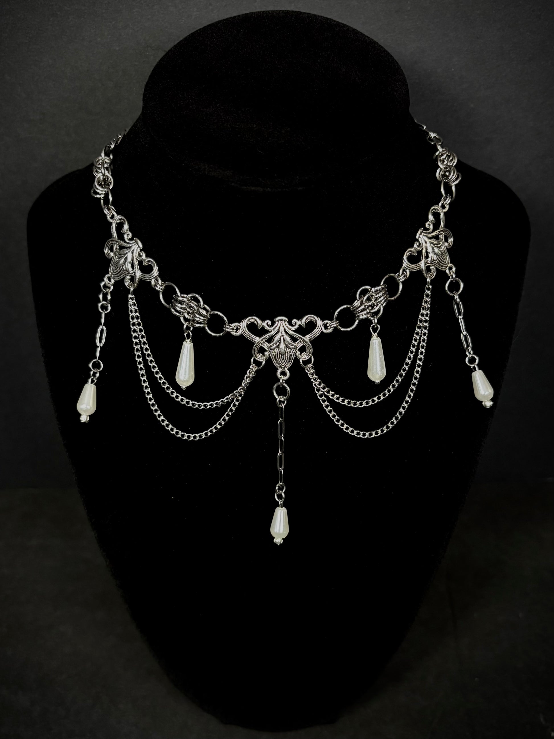Elegance meets dark romance in this Victorian Swan Lake-inspired choker. Featuring ornate filigree accents, layered draped chains, and luminous pearl drop charms, this piece captures the timeless beauty of gothic sophistication. Each element is carefully designed to create graceful movement and a regal silhouette, perfect for elevating any outfit. Wear it with your favorite gothic attire, a formal evening look, or to add a touch of elegance to everyday fashion. This choker is made for those who want to embody timeless beauty with a darkly romantic edge.