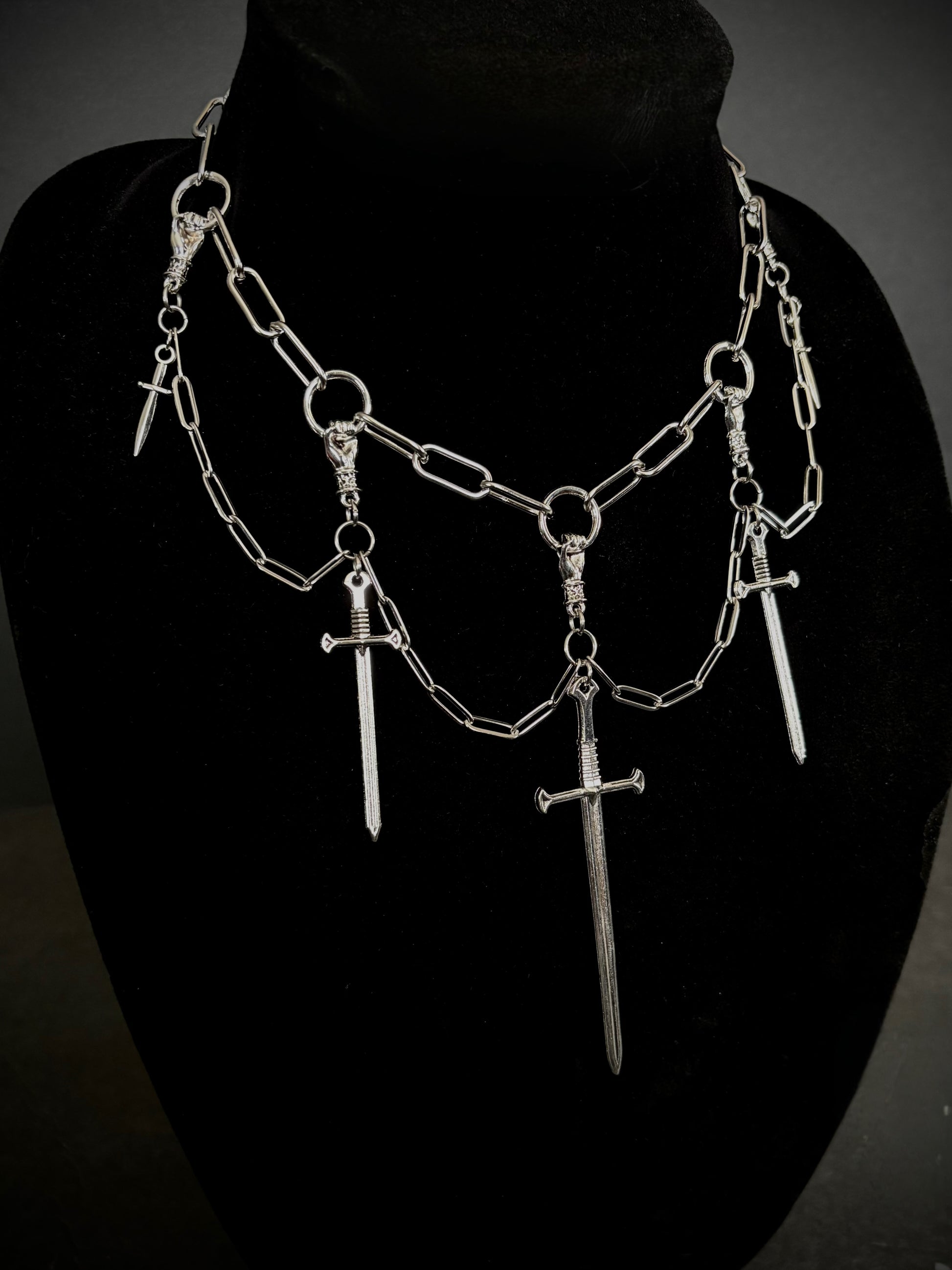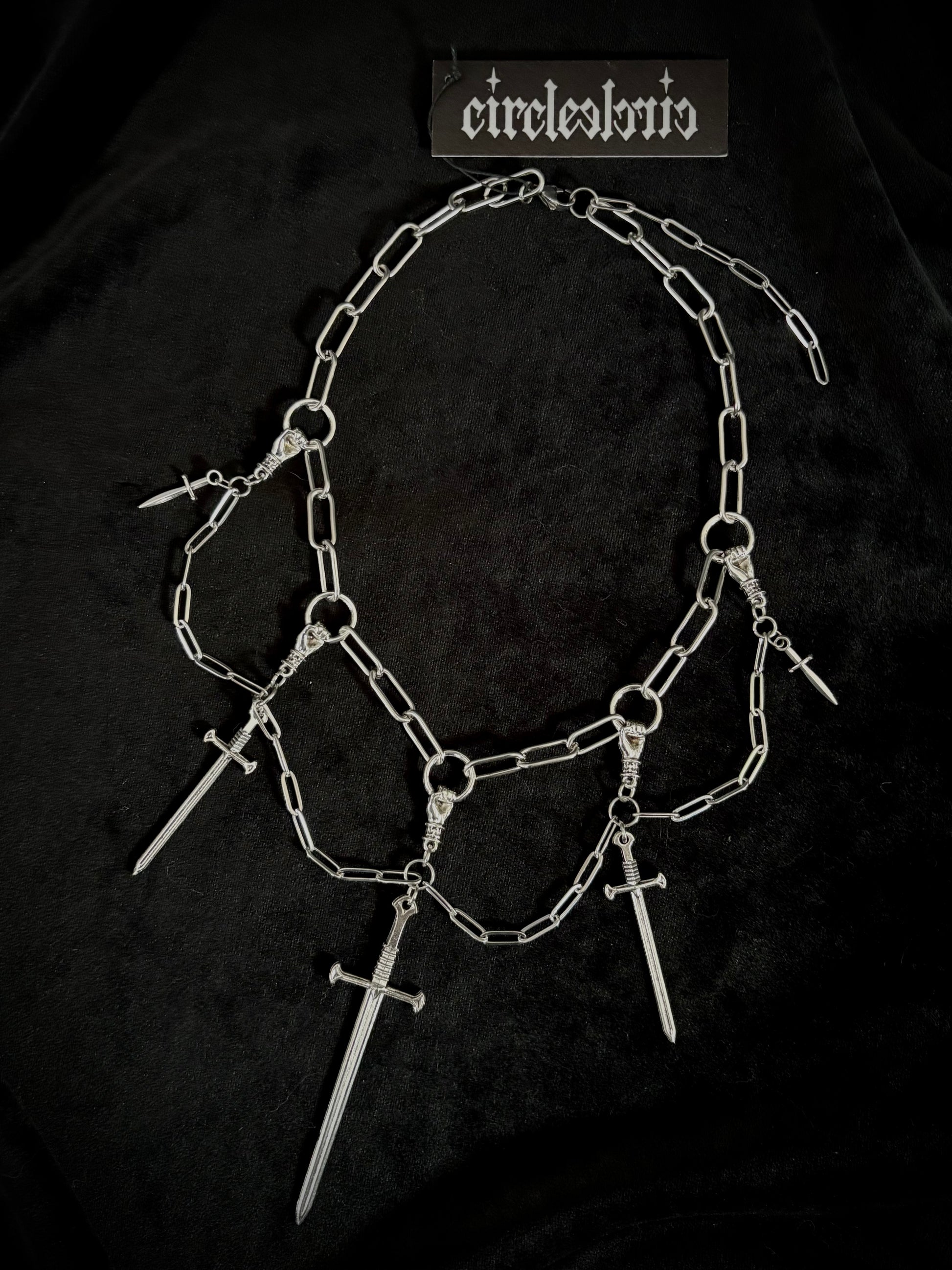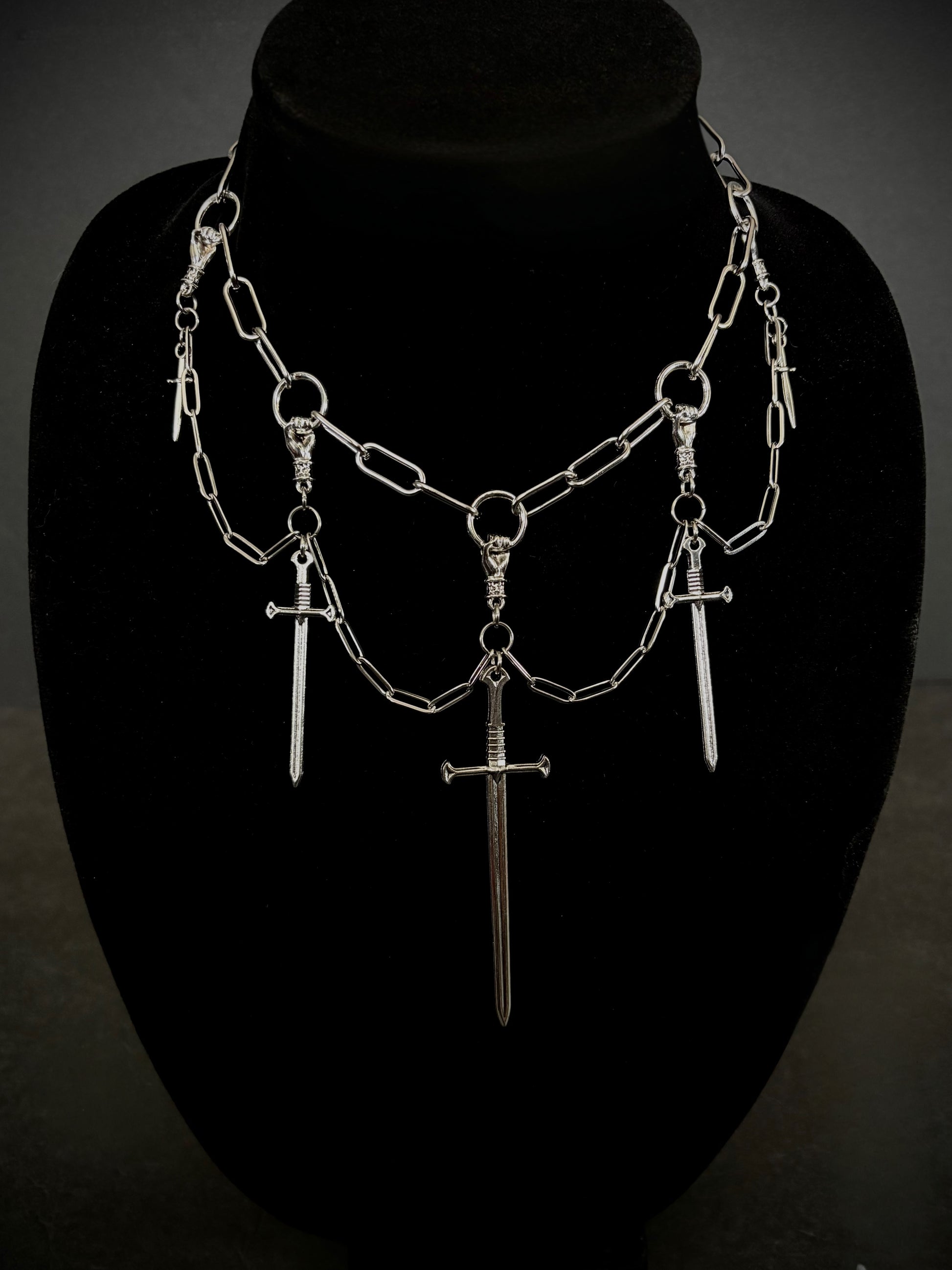 Command attention with this bold statement piece. The Triple Sword Chain Necklace features a layered design of heavy link chains, accented with three detailed sword pendants and two dagger charms for a dramatic, gothic edge. Each blade hangs from sturdy intricate hand O-rings, creating a powerful tiered silhouette that captures both strength and elegance. This necklace is perfect for adding a striking finish to your look—whether you’re dressing for a night out, a festival, or simply channeling your inner warrior in everyday style.