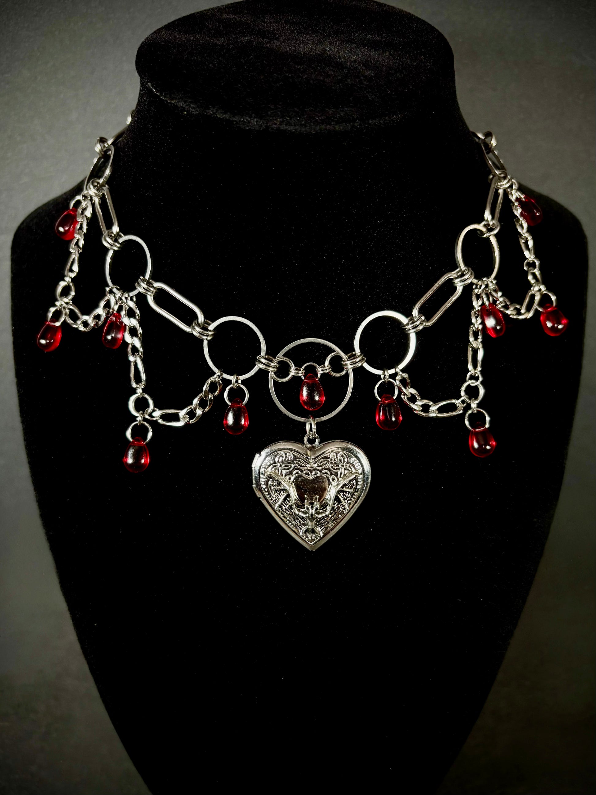 At the center rests an intricately detailed steel heart locket, engraved with ornate designs and opening to hold your most treasured keepsake. The perfect statement accessory for gothic, alternative, or Renaissance-inspired looks.
